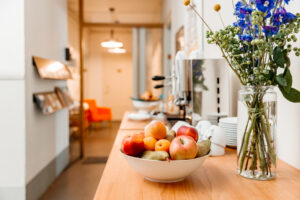 Für das leibliche Wohl sorgt das O Bolles im Erdgeschoss – regional, saisonal, mit Goût-Mieux-Label und einem Küchenchef, der seine Lieferanten persönlich kennt. In der selbstbedienten Verpflegungszone wartet ein fairer Espresso. Auf dem Tisch im Sitzungszimmer steht eine Früchteschale bereit – bio und gratis. Und auf der begrünten Sonnenterrasse trifft man sich zur Pause danach.